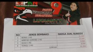 “Paket sembako murah yang disediakan ini terdiri dari 2 Kilo gram beras seharga Rp15 ribu rupiah, 1 liter Minyak Sayur Rp 10 ribu rupiah, 1 Kilo gram Gula Pasir Rp 8 ribu rupiah, dan 1 Kilo gram Tepung Terigu Rp 8 ribu rupiah, dengan harga Rp.41 Ribu rupiah per paket, dari harga tersebut tentunya banyak subsidi yang diberikan kepada masyarakat sebagai wujud kepedulian partai kebangkitan nusantara”, ujar Lucianty.